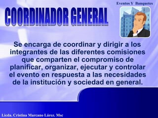 El documento describe los diferentes comités involucrados en la planificación y ejecución de eventos. Explica las funciones clave de cada comité, incluyendo programas, finanzas, apoyo y servicios generales, promoción y relaciones públicas, transporte, seguridad, recepción, registro, alojamiento, alimentos y bebidas, y damas.