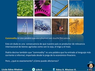 Este documento define los commodities como bienes producidos en masa con baja diferenciación como granos, soja, trigo, maíz, petróleo, oro y plata. Explica que los commodities se clasifican en granos, softs, energías, metales y financieros. Finalmente, señala que si el dólar se revalorizara frente a otras monedas, como muchos creen que sucederá, los precios de los commodities denominados en dólares caerían, afectando negativamente los ingresos de Argentina como gran product