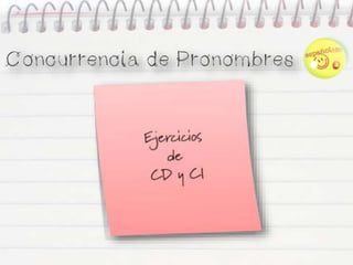 El documento explica el uso y la identificación del complemento directo e indirecto en la oración, incluyendo ejemplos y reglas de colocación. Se discuten los pronombres asociados a estos complementos, su duplicación para evitar ambigüedades, y cómo se transforman en sujeto en la oración pasiva. Además, se abordan situaciones especiales en las que ambos complementos pueden aparecer simultáneamente en la oración.