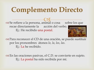 El documento describe los diferentes tipos de complementos verbales que componen el grupo verbal en una oración, incluyendo el complemento directo, que recibe la acción directa del verbo; el complemento indirecto, que recibe la acción indirectamente; y los pronombres que reemplazan a estos complementos como me, te, le, nos, os, les. También explica las reglas para identificar cada complemento y el uso correcto de los pronombres dobles.