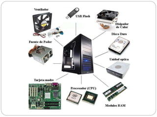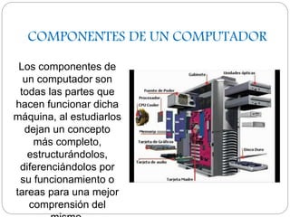 El documento describe los componentes principales de un computador. Explica que los componentes incluyen la motherboard, memoria, tarjetas de video y sonido, discos duros, procesadores y más. Las actividades propuestas son identificar cada componente, explicar su función y ensamblar un computador. El objetivo es que los estudiantes entiendan cómo funciona internamente una computadora y procesen datos e información.