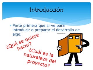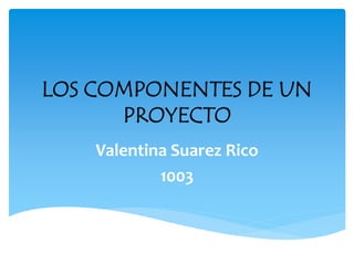 El documento lista los componentes clave de un proyecto. Estos incluyen la introducción, justificación, objetivos, marco teórico, metodología, análisis de resultados, conclusiones, recomendaciones, bibliografía y anexos. Cada componente juega un papel importante en la estructura y desarrollo del proyecto.