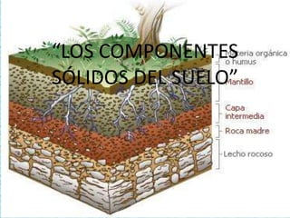 Este documento presenta los objetivos, materiales, procedimientos y resultados de un experimento para identificar los componentes sólidos del suelo. El equipo realizó un procedimiento que incluyó la reacción del suelo con agua oxigenada y ácido clorhídrico para separar la materia orgánica e inorgánica, luego examinaron las muestras bajo un microscopio para identificar minerales como magnetita y calcita. Concluyeron que aprendieron a separar y diferenciar los diversos materiales presentes en el suelo.