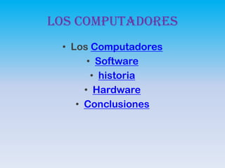 El documento describe la historia y componentes básicos de los computadores. Explica que una computadora es una máquina electrónica que procesa información y puede usarse para tareas de oficina, almacenar datos y comunicarse. Luego describe que el hardware son los componentes físicos como cables y gabinetes, mientras que el software son las instrucciones lógicas. Finalmente resume que la primera máquina de calcular fue inventada por Blaise Pascal en 1642 y que los computadores modernos aceptan datos de entrada, los procesan y producen una salida.