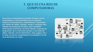 Este documento trata sobre conceptos básicos de redes e Internet. Explica que una red de computadoras conecta equipos para compartir información y recursos, y define una red LAN como una red dentro de un área geográfica pequeña con la misma tecnología. También define una red WAN como una red que une varias LAN aunque sus miembros no estén en la misma ubicación física.