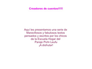 Los resúmenes presentan historias cortas escritas por niños de una escuela hogar. Las historias incluyen a personajes como una vaca llamada Luli, una princesa llamada Alexia, un hombre llamado Arturo con una espada mágica, un caracol y una araña, y más.