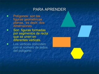 El documento habla sobre los polígonos y cuadriláteros. Explica que los polígonos son figuras geométricas planas formadas por segmentos de recta unidos en vértices, y que dependiendo del número de lados toman un nombre como triángulo, cuadrilátero, pentágono, etc. Luego se enfoca en los cuadriláteros, que son polígonos de 4 lados, y describe las características del cuadrado, rectángulo y rombo. Finalmente incluye algunas preguntas sobre estos conceptos.