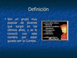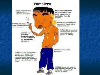 Los Cumbieros son un grupo de jóvenes que surgió en Argentina en los últimos años y se caracterizan por usar ropa y accesorios de marca caros, teñirse el cabello de rubio o platinado, consumir marihuana, y utilizar un vocabulario particular. Aunque usan símbolos religiosos, cometen delitos, y sus letras tratan temas como las drogas y la violencia. Su música se ha popularizado en varios países de América Latina a pesar de ser criticada por el contenido de sus letras.