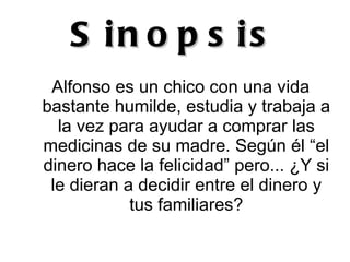 El resumen presenta la sinopsis de una historia sobre un chico llamado Alfonso que trabaja para pagar los medicamentos de su madre enferma. El documento también presenta breves descripciones de los personajes principales como Alfonso, Natalia y Dustin, así como el lugar y la época en que se desarrolla la historia. Finalmente, comienza a narrar el inicio de la historia sobre cómo Alfonso es despertado por un perro que lo lleva a una caja misteriosa.