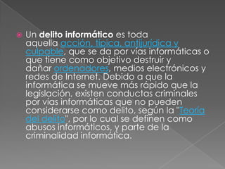 Un delito informático es cualquier acción ilegal que use computadoras o redes para dañar sistemas o robar información. Aunque la tecnología avanza más rápido que las leyes, ahora existen leyes que protegen sistemas de información y sancionan delitos cometidos usando tecnología. La criminalidad informática incluye fraude, robo y otros delitos tradicionales cuando se usan computadoras, y se ha vuelto más frecuente e sofisticada con Internet y programación.