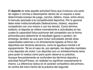 El documento describe varios aspectos relacionados con los deportes. Define el deporte y distingue entre deporte y actividad física. Explica que el crecimiento de los medios y el tiempo libre han llevado a la profesionalización del deporte. También describe la influencia positiva del deporte en la educación, economía y salud pública de la sociedad. Finalmente, brinda detalles sobre algunos deportes populares en Argentina como el fútbol, tenis y pato.