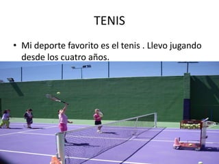 El documento habla sobre varios deportes y actividades que le gustan a Irene de la Puente. Menciona que su deporte favorito es el tenis, que ha jugado desde los 4 años. También disfruta del yudo, patinaje, golf, esquí, petanca, baloncesto y fútbol. Explora cuevas con amigas durante las vacaciones de Navidad.