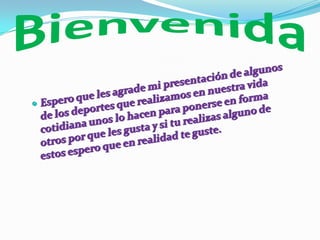 La presentación describe tres deportes populares: fútbol, voleibol y béisbol. El orador espera que la presentación ayude a los espectadores a apreciar los deportes que practican en su vida diaria, ya sea para mantenerse en forma o por diversión.