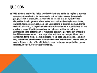 El deporte se refiere a actividades físicas que involucran reglas y competición dentro de un área designada, a menudo asociadas con competición. Los deportes generalmente están institucionalizados por federaciones o clubes y requieren competir contra otros o uno mismo. Algunos ejemplos de deportes son el ajedrez, artes marciales, atletismo, canoa, caza, ciclismo, fútbol y gimnasia.