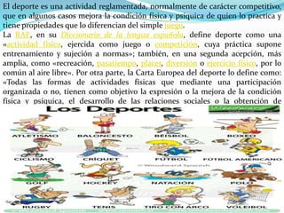 El deporte es una actividad reglamentada y competitiva que mejora la condición física y psíquica. La RAE lo define como una actividad física practicada como juego o competición que requiere entrenamiento y sujeción a normas. La Carta Europea del Deporte incluye cualquier actividad física organizada o no con el objetivo de mejorar la condición física y psíquica o desarrollar relaciones sociales.