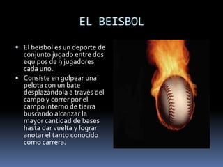 EL BEISBOLEl beisboles un deporte de conjunto jugado entre dos equipos de 9 jugadores cada uno.Consiste en golpear una pelota con un bate desplazándola a través del campo y correr por el campo interno de tierra buscando alcanzar la mayor cantidad de bases hasta dar vuelta y lograr anotar el tanto conocido como carrera.