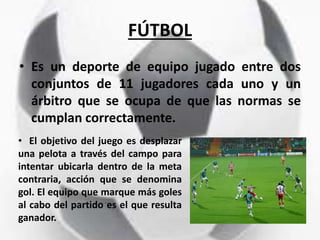 El documento resume varios deportes populares como el fútbol, baloncesto, atletismo, gimnasia artística y waterpolo. Describe las reglas básicas, objetivos y posiciones de cada deporte.