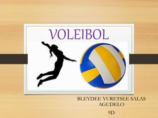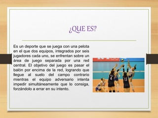 El documento habla sobre el voleibol. Explica que es un deporte que se juega entre dos equipos divididos por una red, con el objetivo de pasar el balón al otro lado de la cancha sin que toque el suelo. Describe también algunas reglas básicas como los tres toques máximos por equipo y que solo se puede golpear el balón con las manos y brazos. Por último, detalla algunos beneficios para la salud que proporciona la práctica de este deporte como ponerse en forma, mejorar el equilibrio y la flex