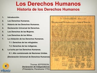 Este documento presenta un resumen de la Unidad 4 sobre los Derechos Humanos. Explica brevemente la historia de los derechos humanos desde el siglo XVIII, incluyendo declaraciones como la Declaración de Independencia de EE.UU. de 1776 y la Declaración de Derechos del Hombre y del Ciudadano de 1789. Luego describe la Declaración Universal de Derechos Humanos de 1948 proclamada por Naciones Unidas, la cual consta de un preámbulo y 30 artículos que definen los derechos y libertades fundamentales de