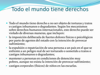 El documento aborda los derechos humanos fundamentales, destacando el derecho a la vida, la libertad y la prohibición de torturas y tratos inhumanos. Se enfatiza que el derecho a la vida es esencial y fundamental para la existencia de otros derechos, ya que garantiza la integridad del individuo. Además, se menciona la libertad de expresión como un pilar de la participación política y el progreso social, respaldada por importantes declaraciones y tratados internacionales.