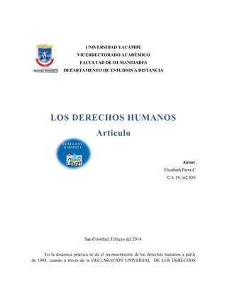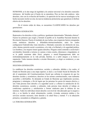 Este documento resume los tres tipos de derechos humanos: la primera generación incluye los derechos civiles y políticos; la segunda generación comprende los derechos económicos, sociales y culturales; y la tercera generación cubre el derecho a la autodeterminación. También describe cómo la Constitución venezolana de 1999 reconoce plenamente los derechos humanos existentes y futuros. Finalmente, discute brevemente el papel de la moral en relación con los derechos humanos desde la época romana.