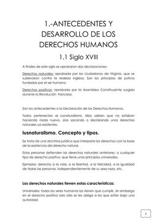 Este documento describe la evolución histórica y los principios fundamentales de los derechos humanos. Comienza analizando los antecedentes en los siglos XVIII y XIX, incluyendo las primeras declaraciones de derechos y el desarrollo del iusnaturalismo y positivismo jurídico. Luego, explica la Declaración Universal de Derechos Humanos de 1948 de las Naciones Unidas, su elaboración e importancia. Finalmente, resume las características, clasificaciones y grupos de derechos humanos.