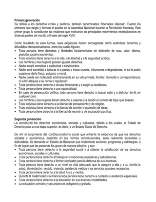 Los derechos humanos son prerrogativas inherentes a la persona que son indispensables para su desarrollo integral. El Estado debe reconocer y garantizar estos derechos establecidos en la constitución y leyes. Los derechos humanos se clasifican en tres generaciones: derechos civiles y políticos, derechos económicos, sociales y culturales, y derechos de solidaridad. Grupos vulnerables como los pobres carecen de los recursos para ejercer plenamente sus derechos.