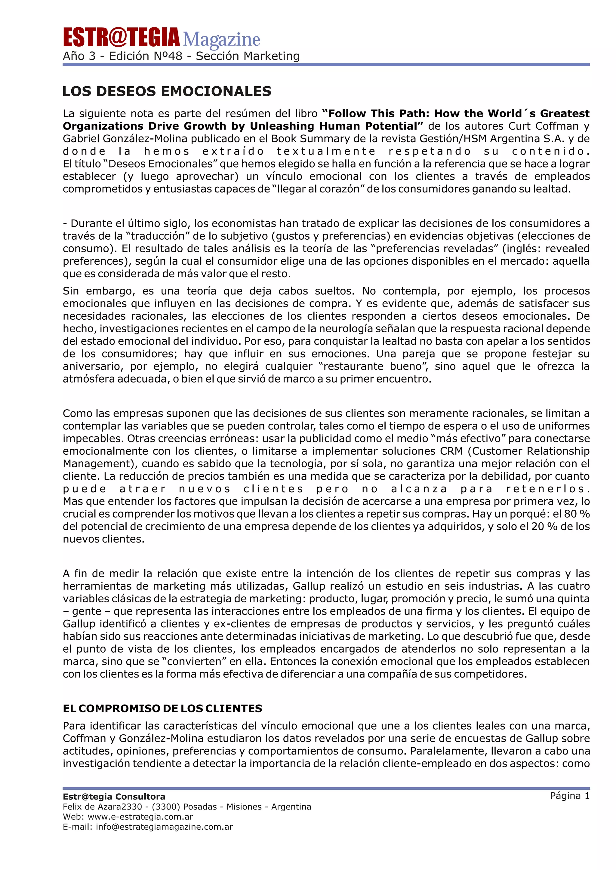 El documento describe cómo las empresas pueden establecer vínculos emocionales con los clientes a través de empleados comprometidos. Explica que las decisiones de los clientes no son solo racionales sino también emocionales. Detalla cuatro niveles de compromiso emocional de los clientes (confianza, integridad, orgullo y pasión) y cómo las empresas pueden desarrollar cada nivel a través de sus empleados. Concluye que las mejores empresas descubren los talentos de sus empleados para crear conexiones emocional