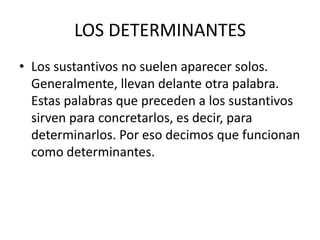 Este documento describe los diferentes tipos de determinantes que pueden preceder a los sustantivos, incluyendo artículos, demostrativos, posesivos, numerales e indefinidos. Explica que el artículo es uno de los determinantes más comunes y que su función es anunciar la presencia de un sustantivo e indicar su género y número. Además, detalla las formas contractas y no contractas del artículo en español.