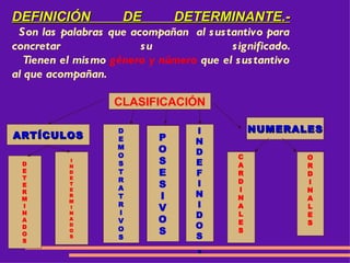 DEFINICIÓN DE DETERMINANTE.- Son las palabras que acompañan al sustantivo para concretar su significado. Tienen el mismo género y número que el sustantivo al que acompañan. CLASIFICACIÓN ARTÍCULOS D E M O S T R A T R I V O S P O S E S I V O S I N D E F I N I D O S . NUMERALES D E T E R M I N A D O S I N D E T E R M I N A D O S C A R D I N A L E S O R D I N A L E S