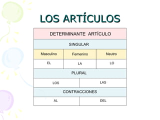 Este documento presenta una lista de diferentes tipos de artículos en español, incluyendo determinantes, demostrativos, posesivos, numerales, interrogativos y exclamativos e indefinidos. La lista incluye ejemplos de cada tipo de artículo con sustantivos comunes como niño, niña, perro y rotuladores para ilustrar sus usos.