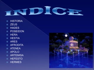 Este documento presenta a los doce dioses olímpicos de la mitología griega. Los principales dioses olímpicos son Zeus, Poseidón, Hades, Hera, Hestia, Ares, Afrodita, Atenea, Apolo, Artemisa, Hefesto y Hermes. Estos dioses gobernaban desde la cima del monte Olimpo y se habían convertido en los dioses supremos después de ayudar a Zeus a derrotar a los Titanes.