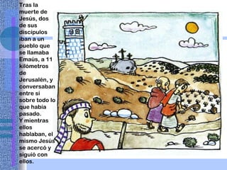 Dos discípulos de Jesús iban caminando tristemente de Jerusalén a Emaús después de su muerte, cuando Jesús resucitado se les unió sin que lo reconocieran. Jesús les explicó las Escrituras y cómo debía sufrir el Mesías, y al compartir la cena les reveló su identidad al partir el pan. Reconociéndolo, regresaron apresurados a Jerusalén para contar a los apóstoles que habían visto a Jesús resucitado.