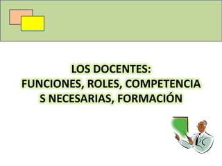 Este documento describe las funciones, roles y competencias necesarias de los docentes. Explica que los docentes deben diagnosticar las necesidades de los estudiantes, planificar cursos y diseñar estrategias de enseñanza. También deben motivar a los estudiantes, ofrecer una enseñanza centrada en el estudiante que considera la diversidad, y ofrecer tutoría y ser un ejemplo a seguir. Además, los docentes deben investigar con los estudiantes, desarrollarse profesionalmente de forma continua, y colaborar en la gest
