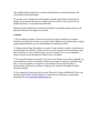 El documento discute la importancia de la prevención temprana del consumo de drogas en las escuelas. Propone que los docentes deben recibir capacitación para abordar este tema y que los programas de prevención deben comenzar desde el jardín de infantes con la participación de los padres. Describe dos tipos de prevención: la específica, que brinda información sobre drogas, y la inespecífica, que promueve actividades extracurriculares y el desarrollo de la autoestima. Finalmente, resume consejos de una gu