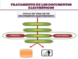 El documento describe los conceptos de expediente electrónico, expediente mixto y el proceso de gestión documental electrónica. Explica que los documentos electrónicos deben organizarse y almacenarse en formatos como TIFF y PDF para garantizar su autenticidad, integridad y conservación a largo plazo. También señala la importancia de implementar estrategias para salvaguardar la información contenida en los documentos electrónicos.