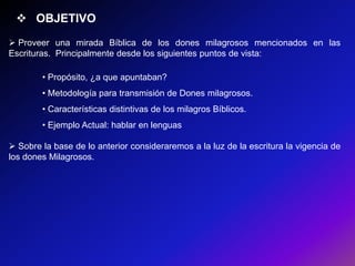 Los milagros en la Biblia servían para confirmar la autoridad y el mensaje de Dios, Jesús y los apóstoles. Se transmitían solo a través de la imposición de manos de los apóstoles a otros discípulos. Eran claros y documentados, tenían muchos testigos, y ocurrían fuera de las leyes naturales.