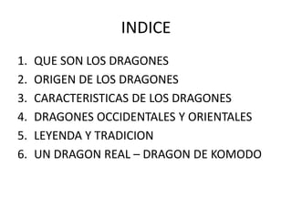 Los dragones son seres mitológicos descritos como reptiles gigantes con características de diferentes animales reales o fantásticas como alas, cuernos o la capacidad de escupir fuego. Existen dragones tanto en la tradición occidental como oriental, siendo los occidentales más parecidos a cocodrilos guardianes de tesoros, mientras que los orientales se describen con partes del cuerpo de diferentes animales y juegan un papel importante en la cultura china. El dragón de Komodo es el único dragón real, siendo el lagarto