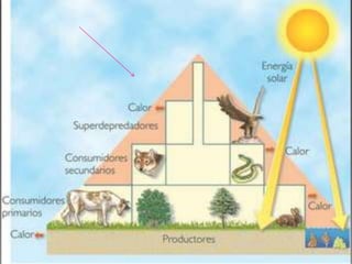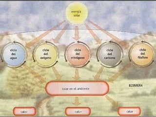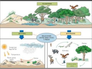 Un ecosistema es el conjunto formado por los seres vivos, factores físicos y relaciones bióticas y abióticas entre ellos. La materia y energía fluyen continuamente entre los componentes de un ecosistema, aunque la materia sigue un ciclo cerrado mientras la energía fluye en una sola dirección. Los organismos obtienen materia y energía de los niveles tróficos inferiores a través de redes tróficas interrelacionadas.