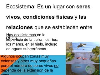 Un ecosistema es un lugar con seres vivos que interactúan entre sí y con su entorno físico. Existen diversos tipos de ecosistemas, tanto grandes como pequeños, que contienen plantas, animales y otros organismos en constante relación e interdependencia a través de cadenas alimentarias. Todos los seres vivos de un ecosistema se adaptan a las condiciones de su hábitat y desempeñan un papel importante como productores, consumidores o descomponedores para el equilibrio del sistema.