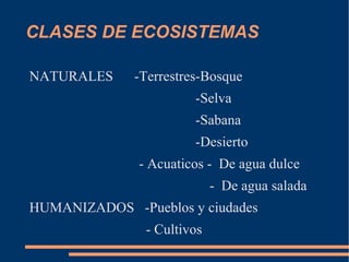Un ecosistema está formado por los seres vivos y el medio físico en el que habitan y sus interacciones. Los ecosistemas naturales incluyen terrestres como bosques, selvas y desiertos, y acuáticos como agua dulce y salada. También existen ecosistemas humanizados como pueblos, ciudades y cultivos. Los ecosistemas cambian de forma natural según las estaciones y el paso de los años, pero también por acciones humanas que pueden ser beneficiosas o perjudiciales para el medio ambiente