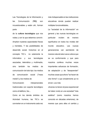 El documento describe los efectos de las tecnologías de la información y la comunicación (TIC) en nuestro entorno. Explica que las TIC amplían nuestras capacidades físicas y mentales y las posibilidades de desarrollo social. También señala que las TIC se han convertido en instrumentos indispensables en las instituciones educativas donde pueden realizar múltiples funciones como la alfabetización digital, el uso personal y didáctico, y la comunicación con familias y el entorno.
