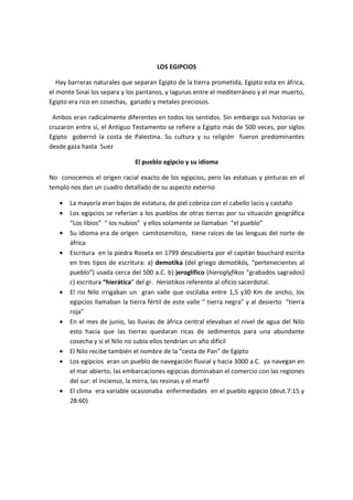 Los egipcios establecieron un poderoso imperio a lo largo del río Nilo, dominado por faraones y una religión politeísta centrada en dioses como Amón-Ra. Su historia incluyó el Reino Antiguo, el Reino Medio, el Reino Nuevo y períodos de dominio extranjero como los hicsos y los persas. Egipto interactuó con Israel y Judá en diferentes momentos, como cuando José se convirtió en visir y cuando los judíos emigraron allí durante el período helenístico.