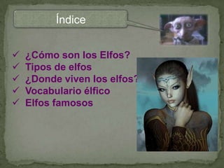 Los elfos son criaturas parecidas a los humanos con orejas puntiagudas y gran habilidad para camuflarse. Existen varios tipos de elfos como los silvanos, grises y oscuros. Suelen vivir en campamentos en los bosques donde disfrutan de la música y la poesía. Son diestros con el arco y conocedores de la naturaleza, y entre los más famosos se encuentran Elron, Galadriel y Legolas.
