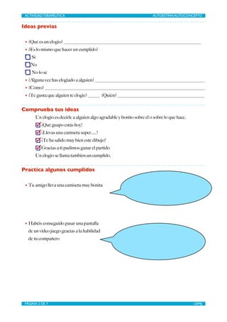 Este documento presenta una actividad terapéutica para mejorar la autoestima a través del uso de elogios. El objetivo es aprender a dar y recibir elogios de manera sincera. Se explica qué son los elogios y cómo se pueden utilizar palabras como "fenomenal" o "perfecto" para elogiar los logros de otros. Además, se pide a los participantes que imaginen situaciones en las que reciben elogios y cómo se sentirían, y que identifiquen cosas positivas sobre sí mismos y en qué son buenos sus amigos.