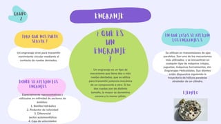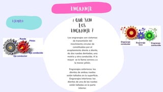 Los engranajes sirven para transmitir movimiento circular mediante ruedas dentadas. Se utilizan en máquinas y vehículos para transmitir potencia mecánica entre componentes. Existen diferentes tipos de engranajes como exteriores, interiores, rectos u helicoidales, que se usan en sectores como automoción, bombas hidráulicas y cajas de velocidades.