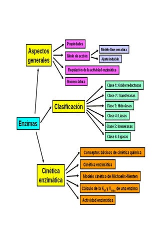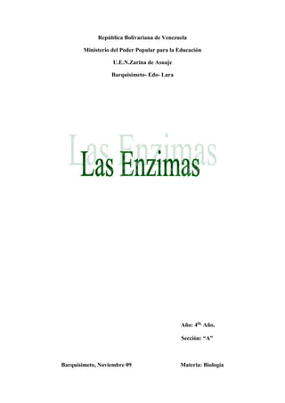 Este documento presenta información sobre las enzimas. Explica que las enzimas son proteínas que catalizan reacciones químicas y están compuestas de aminoácidos. Detalla los factores que afectan la actividad enzimática como el pH y la temperatura. Describe las funciones de las enzimas como facilitar reacciones químicas y liberar energía. Además, explica cómo se nombran las enzimas y sus aplicaciones importantes en la biotecnología industrial.