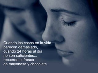 Un profesor llenó un frasco con pelotas de golf, canicas y arena para demostrar a sus estudiantes que la vida está compuesta de cosas importantes y otras menos importantes. Las pelotas de golf representan las cosas más significativas como la familia y la salud, las canicas son otras prioridades como el trabajo, y la arena son las pequeñeces. Al agregar chocolate al frasco, el profesor enseñó que a pesar de lo ajetreada que puede ser la vida, siempre hay espacio para compartir momentos placenteros con otros.