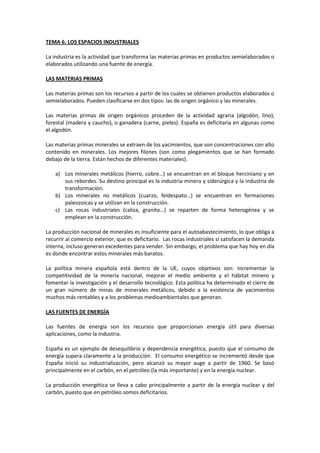 La industria española ha pasado por diferentes etapas de desarrollo desde 1855 hasta 1975. La primera etapa de industrialización entre 1855 y 1900 tuvo lugar con retraso y se vio afectada por condiciones desfavorables como la falta de materias primas y capital. Entre 1900 y 1936 hubo un mayor crecimiento industrial gracias al desarrollo de la minería del carbón y la incorporación de nuevas tecnologías. La guerra civil y la posguerra entre 1936 y 1959 interrumpieron este crecimiento. Finalmente, entre 1960 y 1975 España experimentó un fuerte