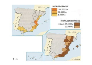 Este documento describe las principales actividades económicas rurales en España, incluyendo la agricultura, ganadería y silvicultura. Detalla los diferentes sistemas de cultivo agrícola según el uso del agua, variedades de cultivos y aprovechamiento del suelo. También analiza los principales cultivos como cereales, legumbres, vid, olivo, hortalizas y frutales. Además, examina la producción ganadera y los cambios hacia la especialización y mayor escala. Por último, resume brevemente la silvicultura y sus desaf
